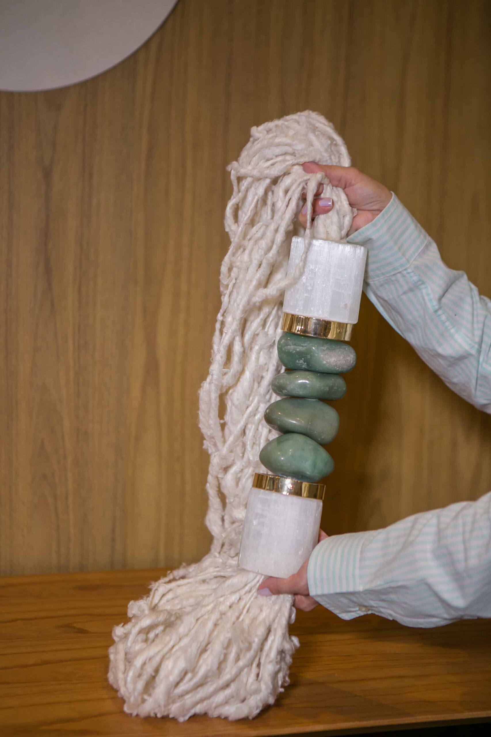 Colar de mesa composto com fio primitivo de seda, pedras quartzo verde e selenita.